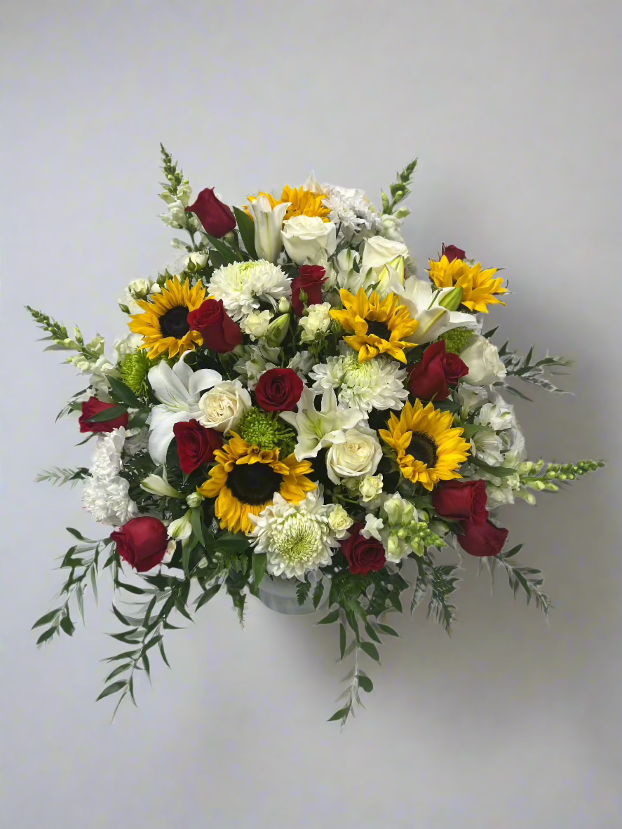 This sunny arrangement of yellow and hints of red roses and mums is a message of joy and hope.