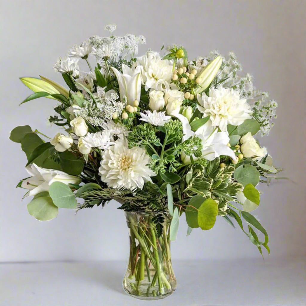 A stunning all white arrangement in a simple glass vase. A perfect table arrangement to greet guests.