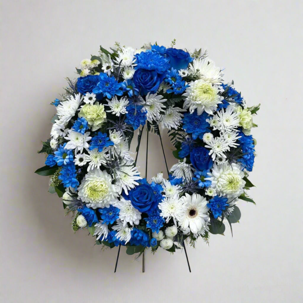 A classic blue funeral wreath, in remembrance of those who have passed for sympathy or any occasion.
