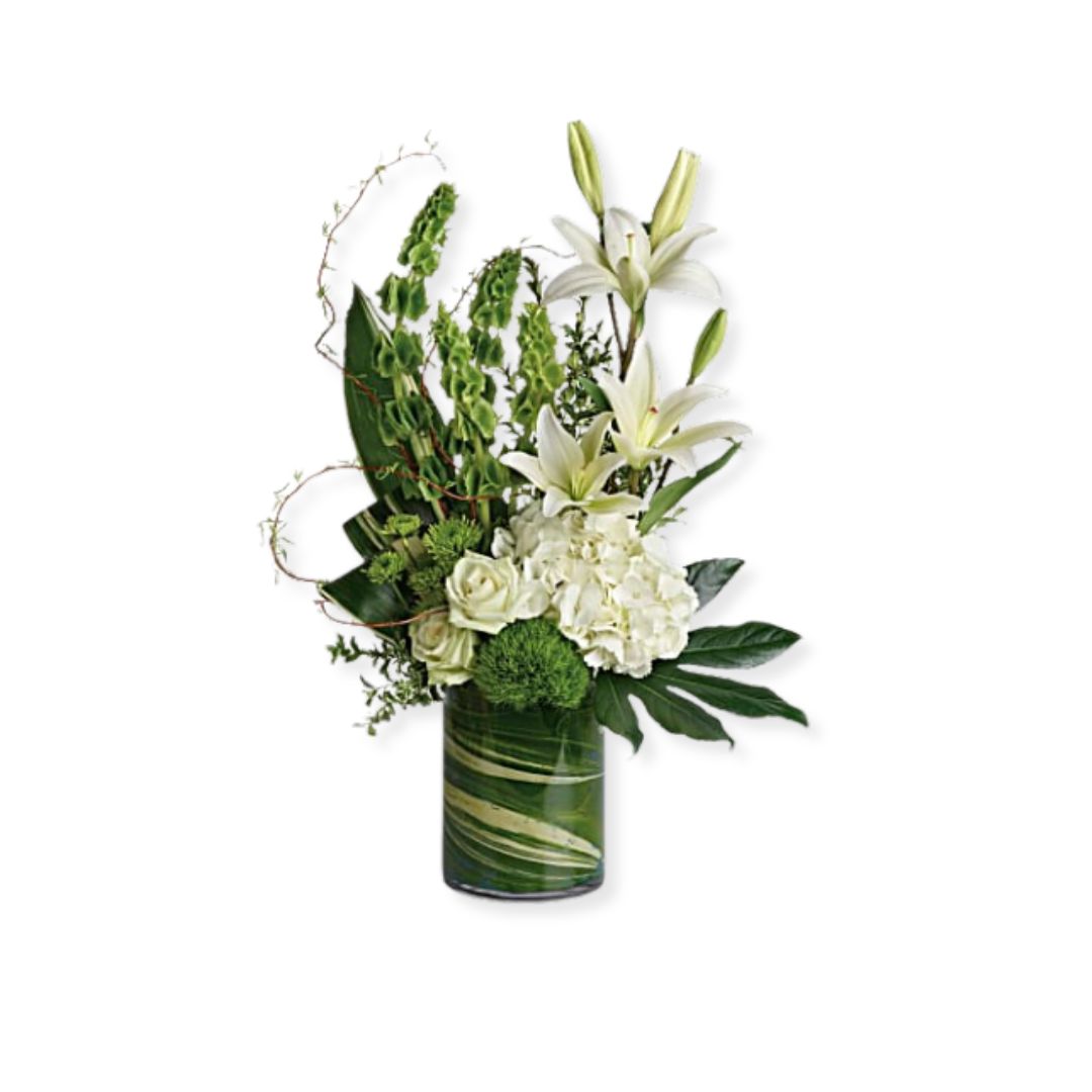 A modern accent for any occasion, this beautiful botanical sculpture blends snow white hydrangea and lilies with unique greens for a peaceful, feel.