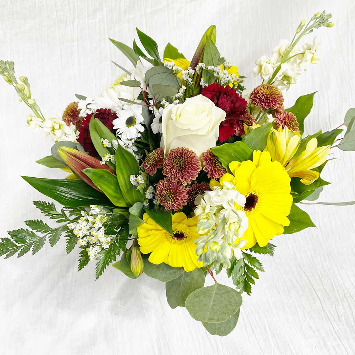 A bundle of seasonal blooms arranged in a simple hobnail vase.