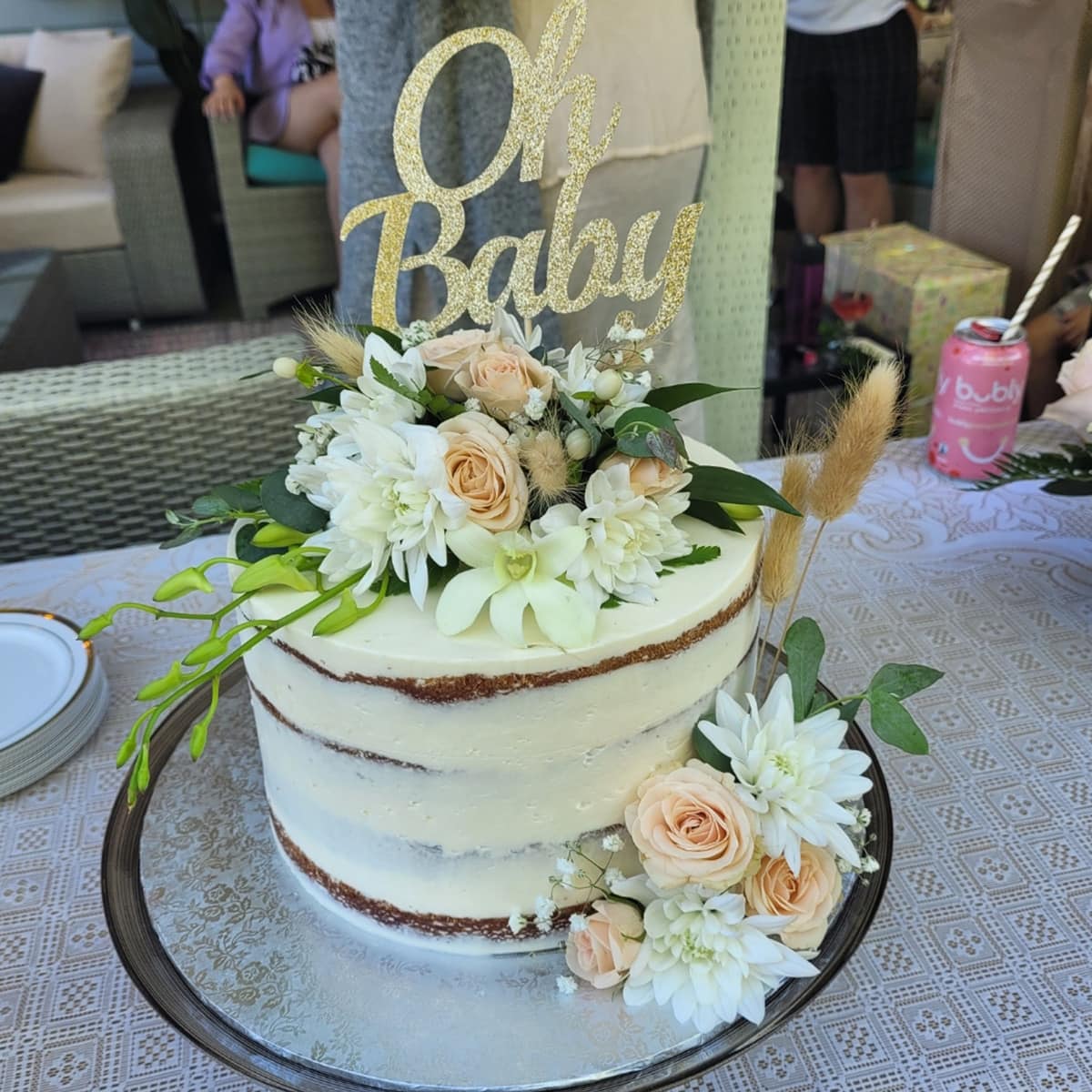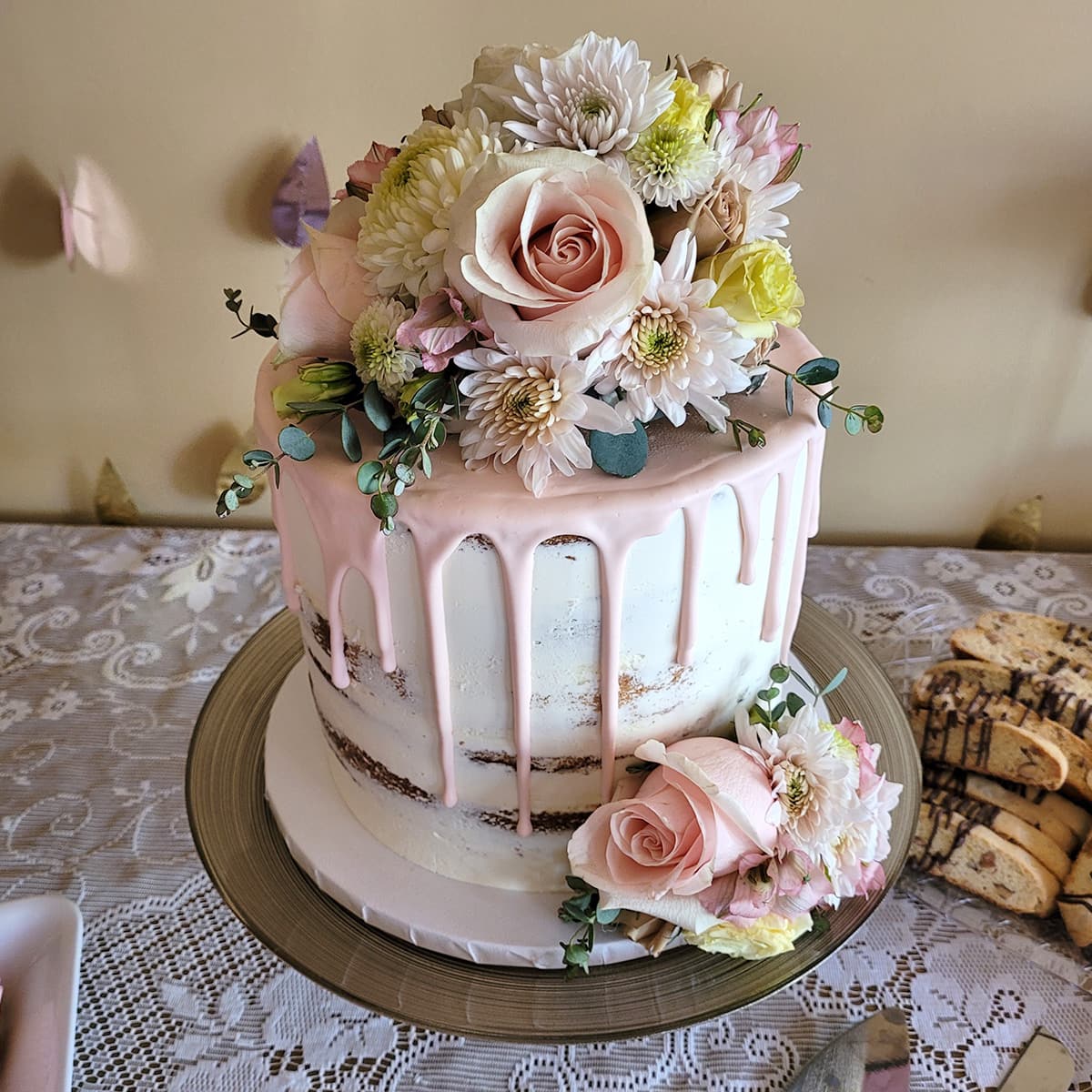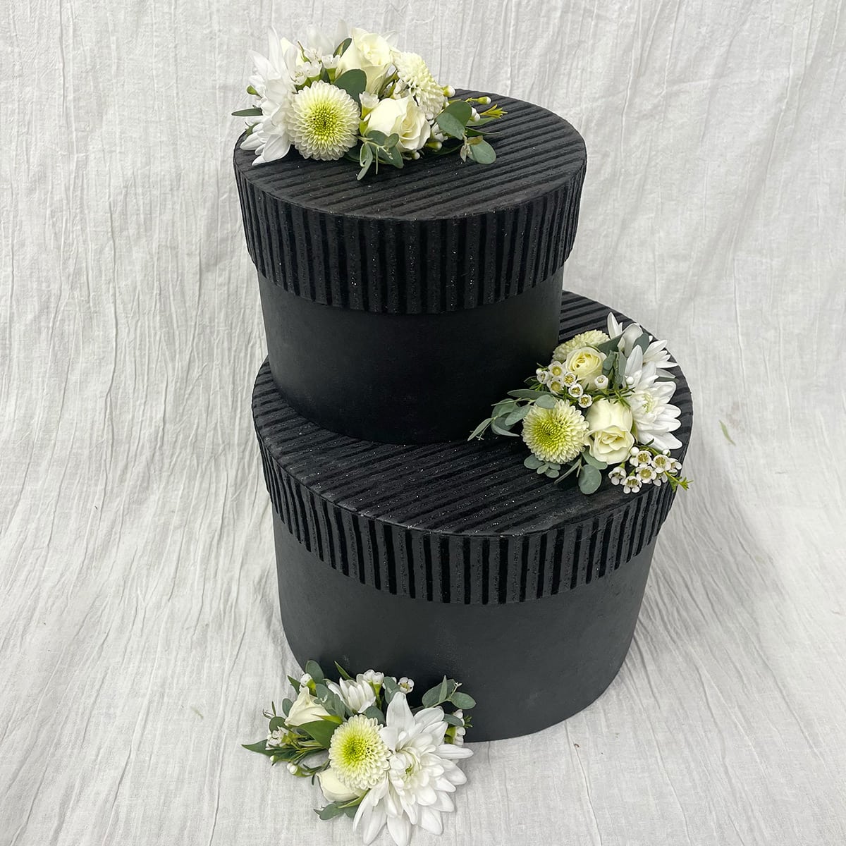A Cake Cluster with delicate blooms surrounded by soft greenery with any colour combination for any occasion.