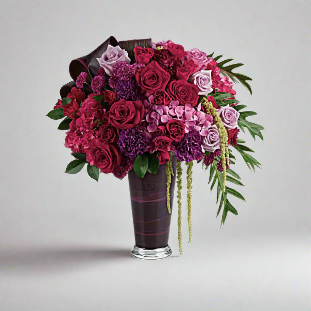 A dramatic display in jewel-toned roses and hydrangea in a sophisticated vase, this majestic bouquet will take their breath away.
