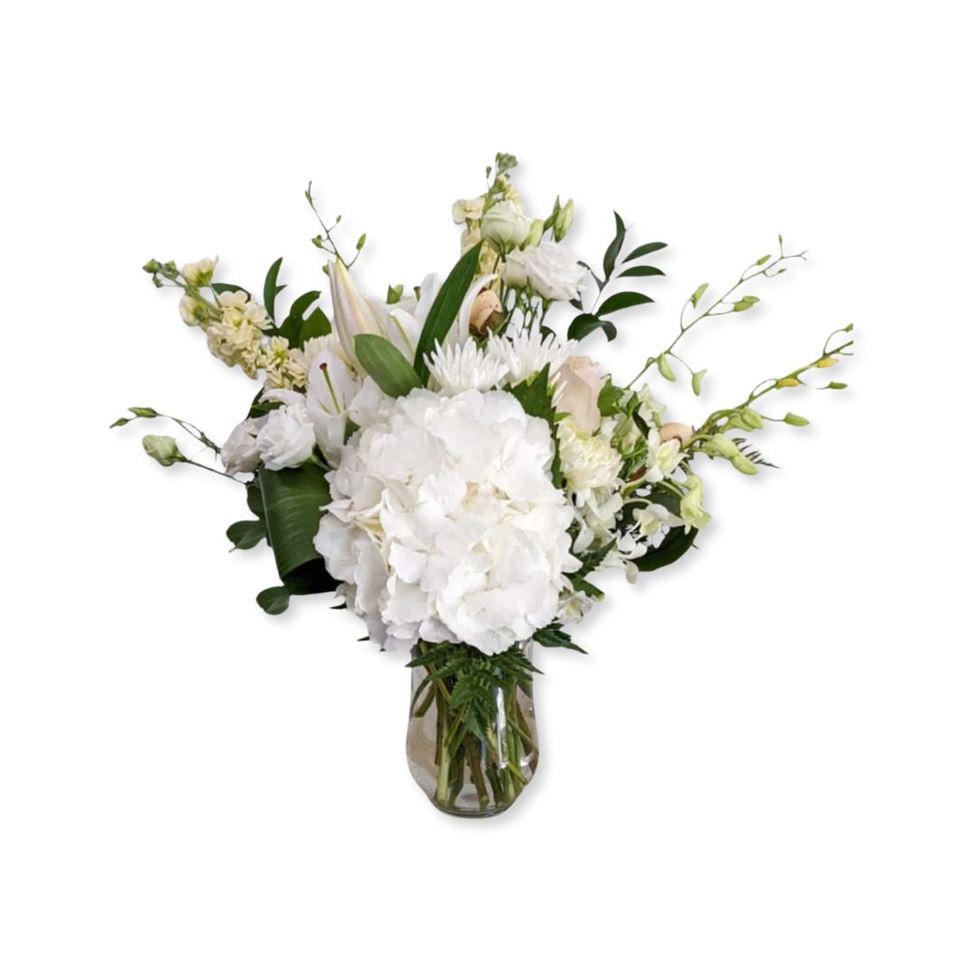 It's contemporary. It's the perfect gift for a sweet someone who's a little of both: Classic Ivory roses and white hydrangea presented in a wow glass vase.