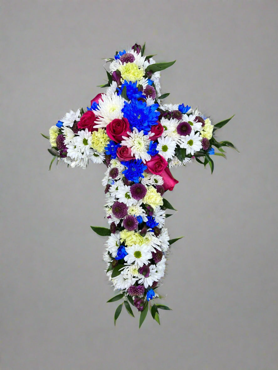A breathtaking standing cross of majestic blooms remembers and honours the departed with a meaningful and moving expression of faith, admiration and divine love.
