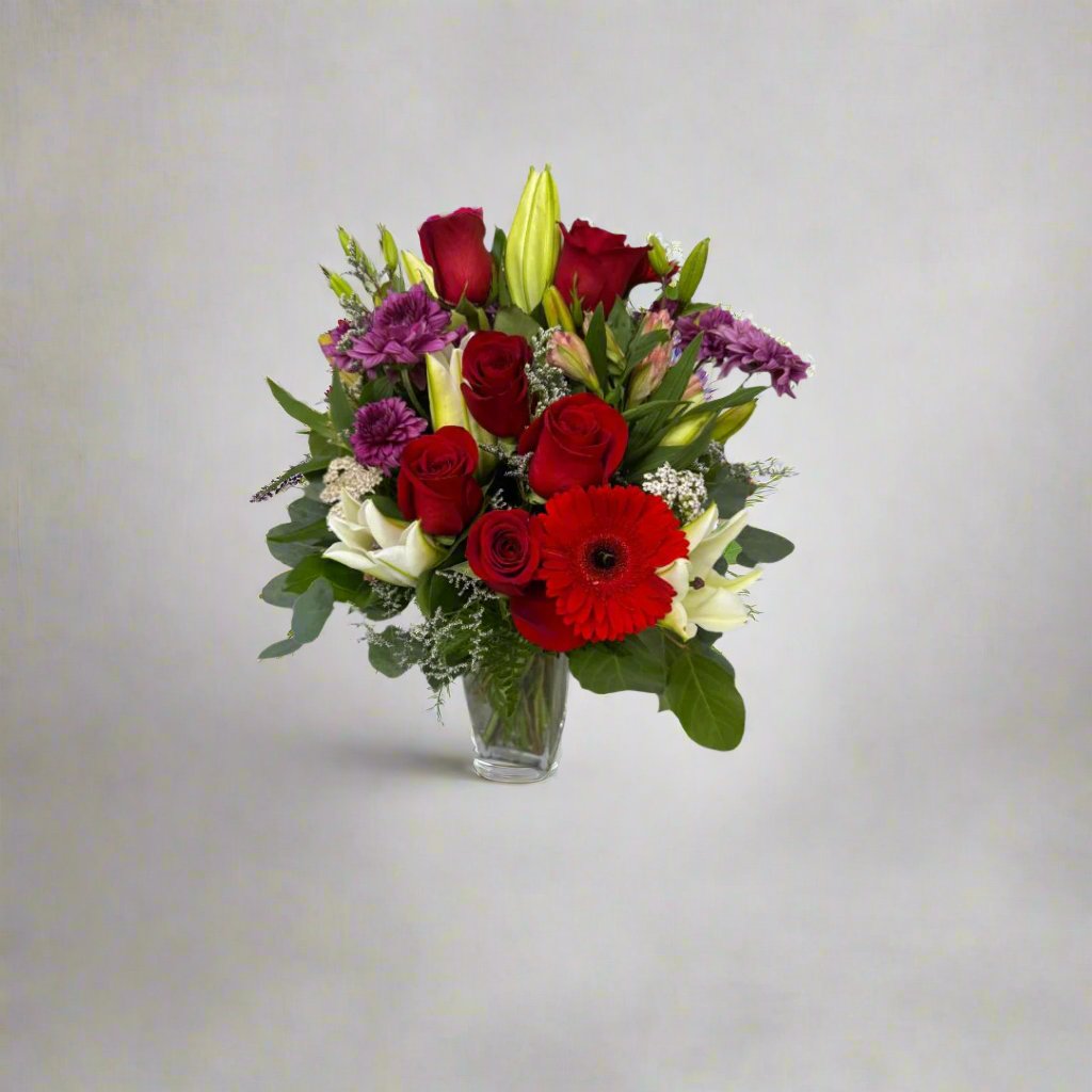 Color them happy with this bold, beautiful mix of pinks, flirty lavenders, and lime greens! Hand-delivered in a glass vase, this posh present pampers your loved one on a special day - or any day at all!
