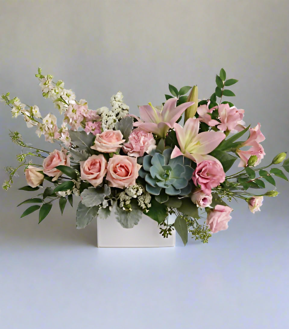 Take their breath away with the beautiful hello that this arrangement brings! A wildly sophisticated array of pale pink roses and lilies with modern greens, it's perfectly presented in a simple basket or vase.