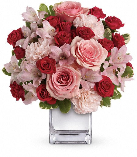 Think pink, then think of all the thank-you kisses you'll get when you send this ravishingly romantic arrangement. Lush pink and red roses, pink alstroemeria and pink carnations in a chic cube. Get ready to pucker up.