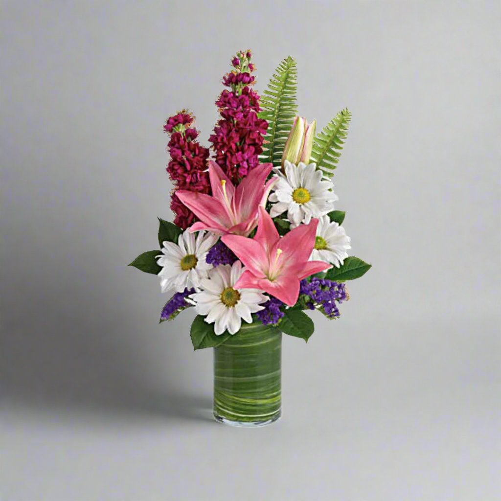 Full of whimsy, this playful bouquet of pink roses, white daisies, pink lilies and fuchsia stock is a fun surprise for any special occasion! It's wrapped in a ti leaf in a glass cylinder vase for a modern touch.