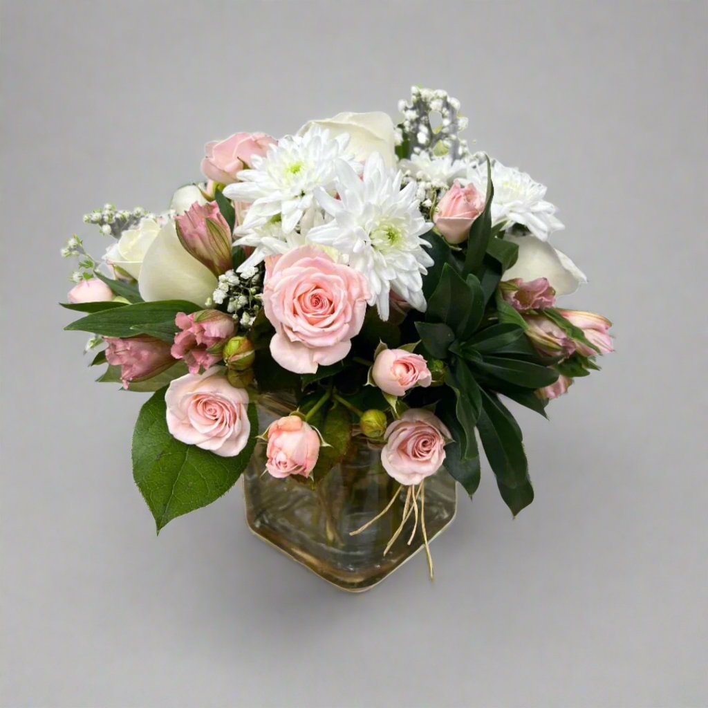 A beautiful cluster of pink roses in a cube.