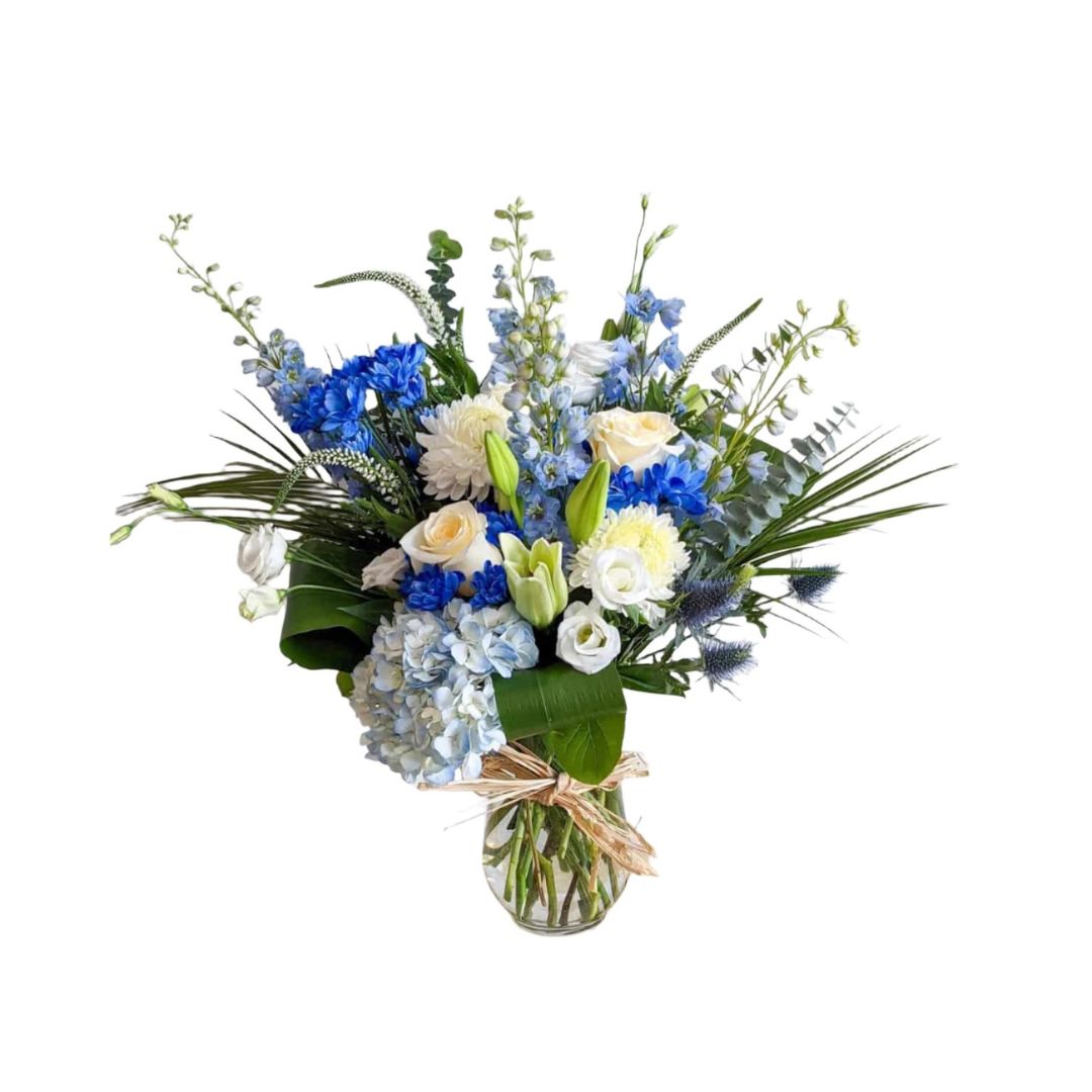 Enjoy some west coast blues with our Sea to Sky arrangement! Featuring an array of natural and artificially coloured blue blooms in a simple glass vase.