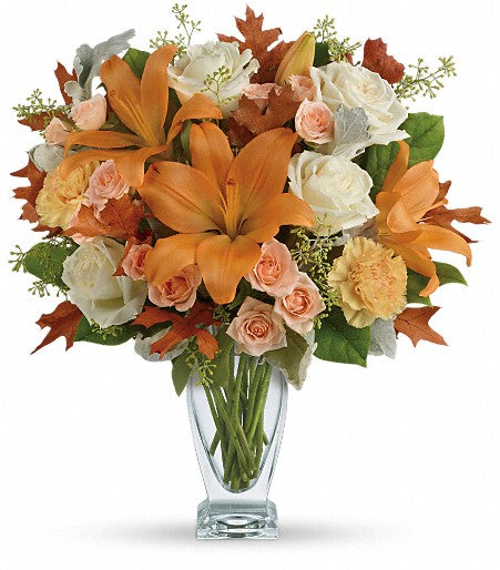 Add sophistication to the season with this gorgeous autumn arrangement. These striking lilies and roses are sure to brighten anyone's day.