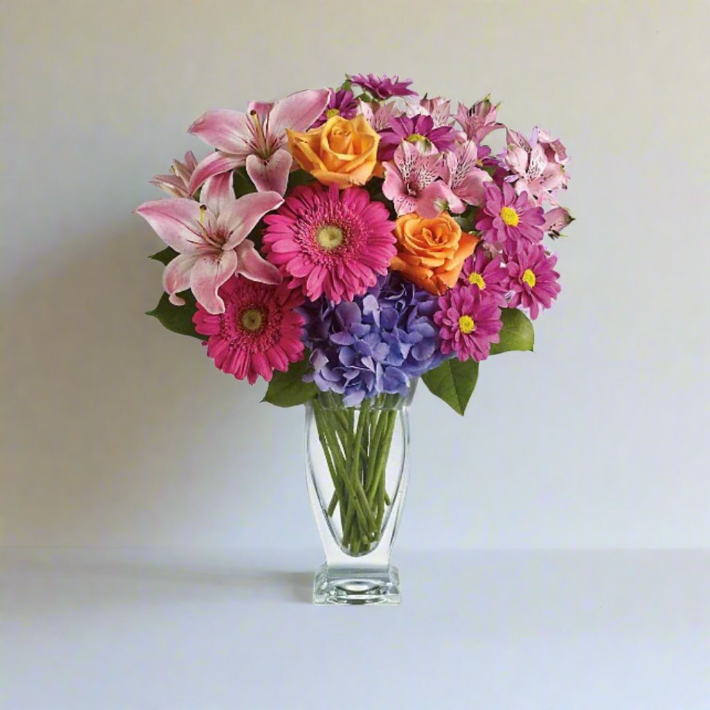 Awe and wonder. That's what's included in this magical bouquet. It's a beautiful mix of radiant blossoms in a stunning glass vase.