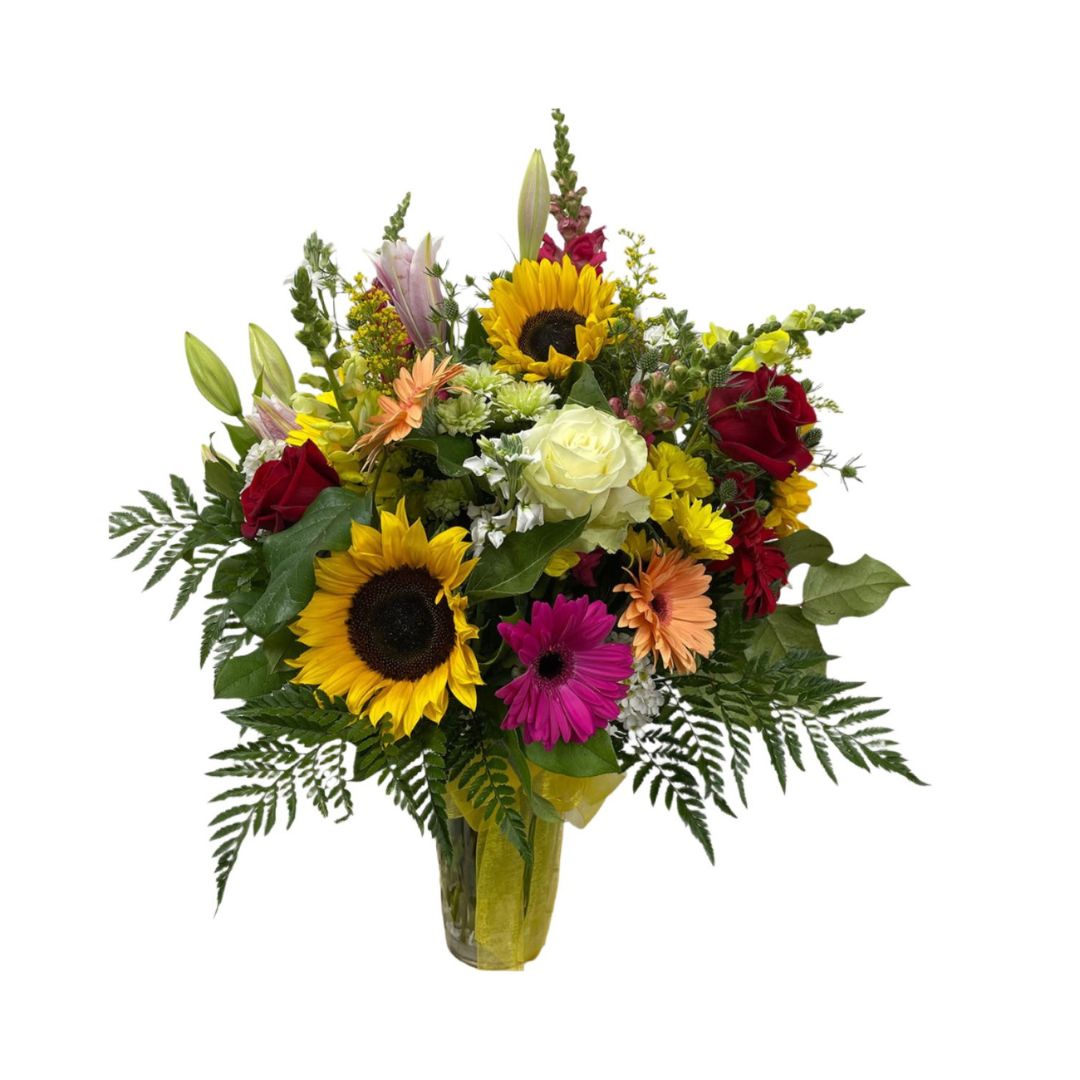 Brighten their day with this magnificent arrangement of golden sunflowers and orange roses, presented in a hand-blown art glass vase, brings the beauty of an ocean sunset to any occasion.